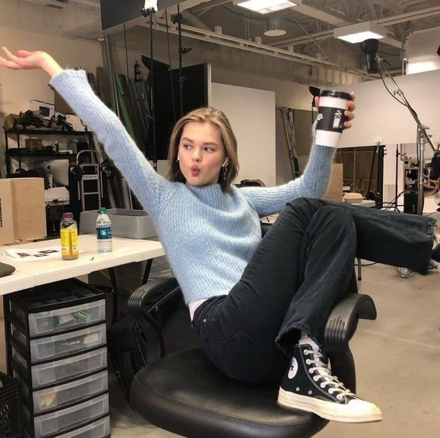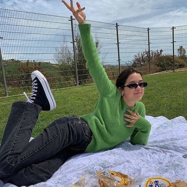 초록 니트에 데님, 컨버스 코디한 가이아 거버 너무 예쁘네