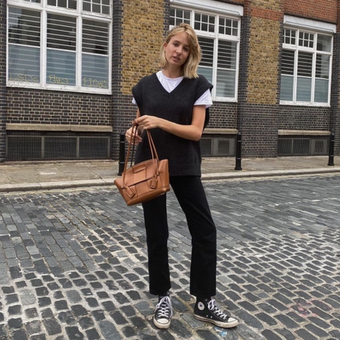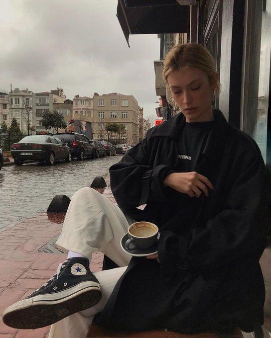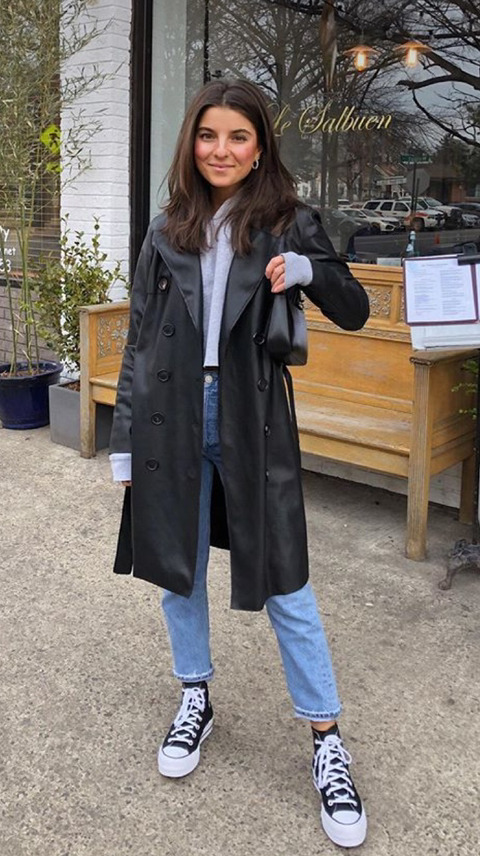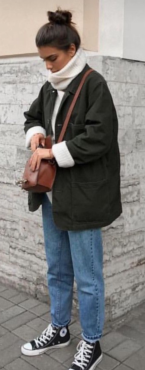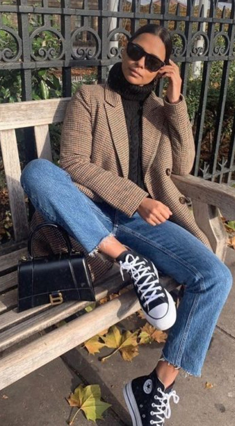 브라운 자켓에 블랙진 블랙 컨버스 하이