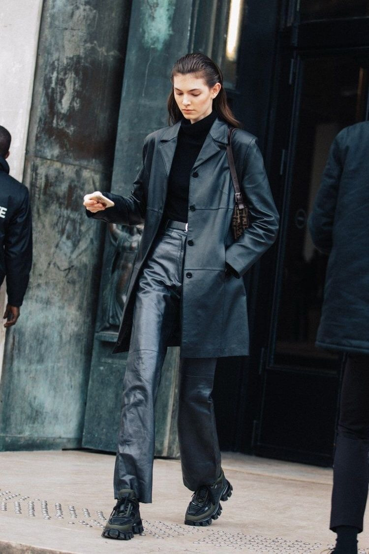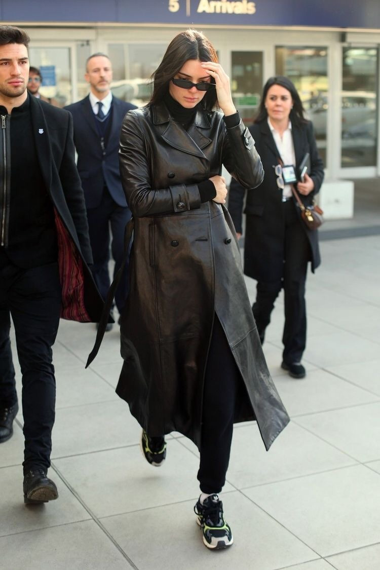 매트릭스 처럼 롱 한 기장의 가죽 자켓을 입은 켄달 제너