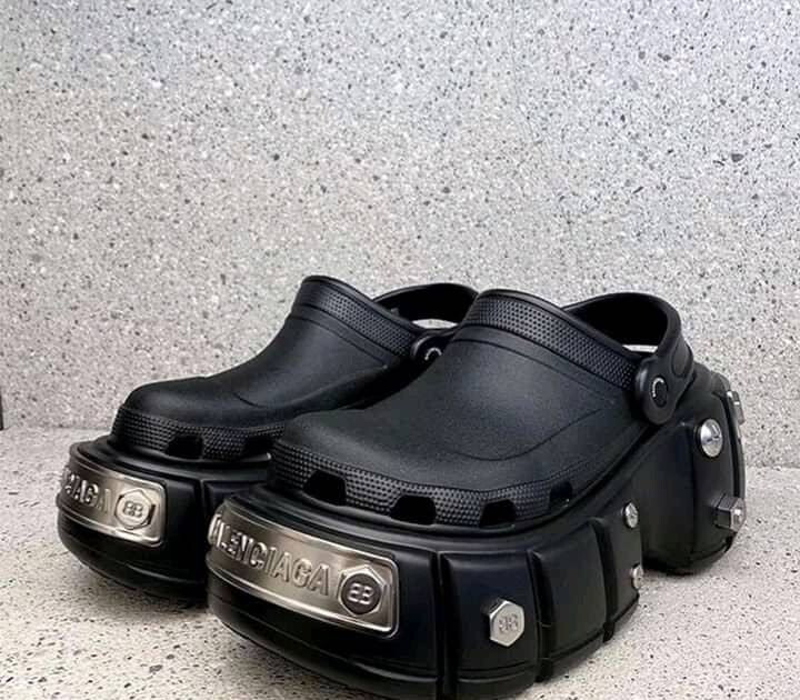 아래는 최근 발렌시아가에서 동그란 구멍을 없애고 통굽에 나사와 로고를 넣은 디자인의 크록스 이미지