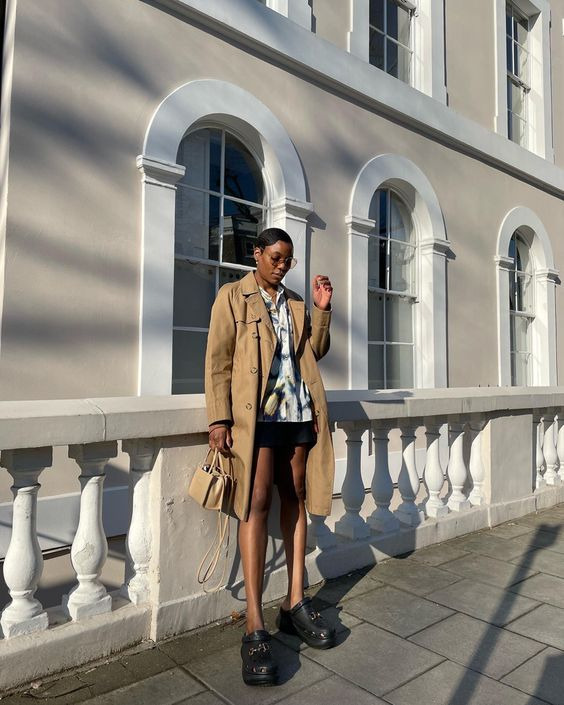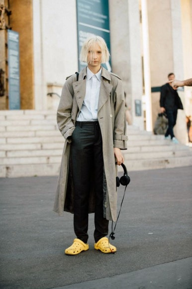 트렌치코트에 노랑 크록스로 포인트 코디가 멋스럽다