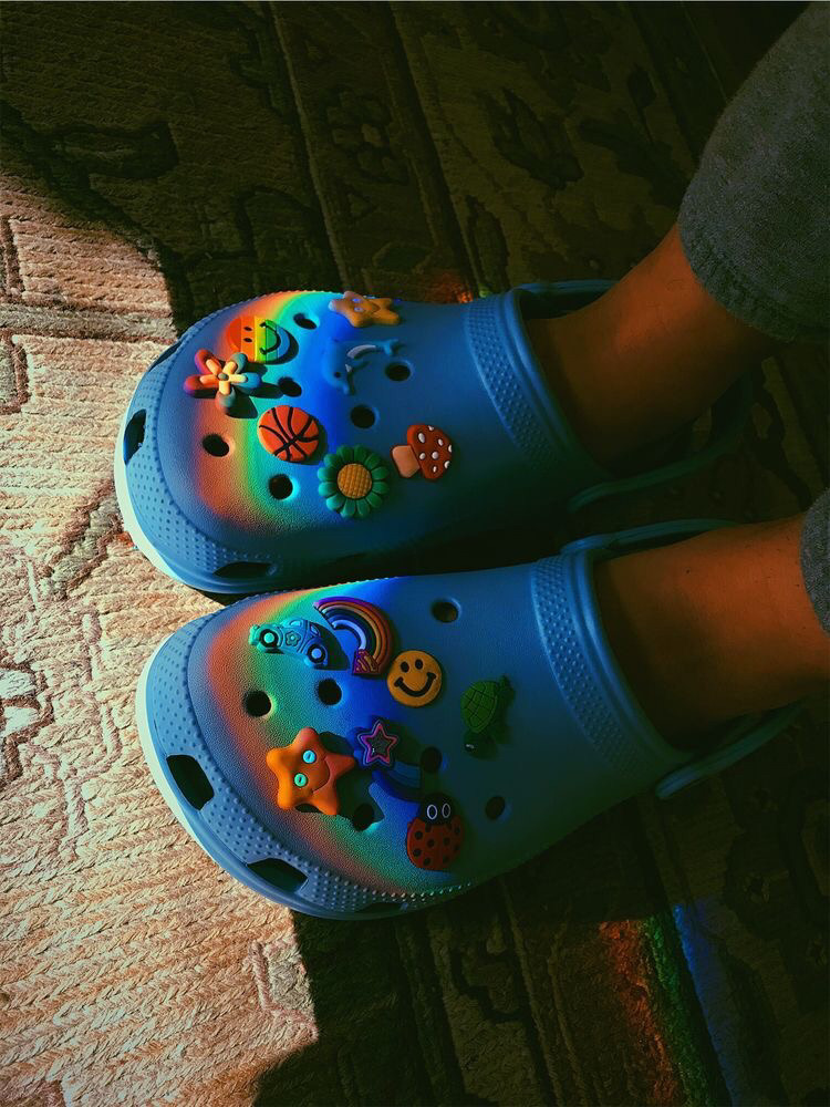알록달록 무지개 빛이 들어오는 창가에서 찍은 듯 한 크록스