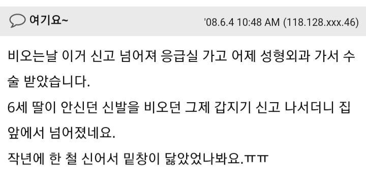 방수 소재로 비 오는 날 신기 좋지만 그만큼 미끄러워서 매우 매우 유의해서 신어야 한다