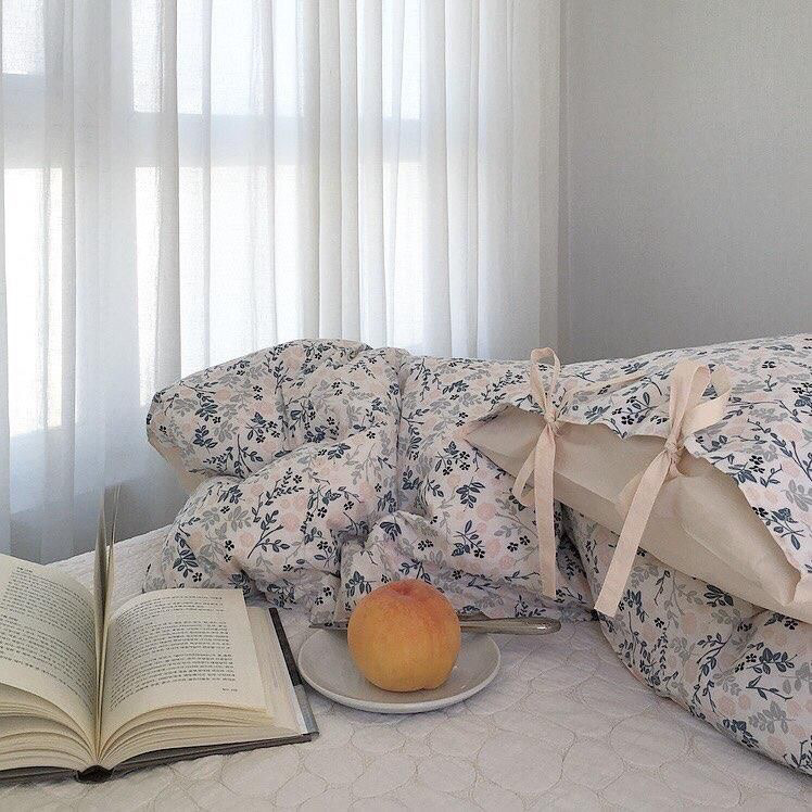 꽃무늬 이불과 과일