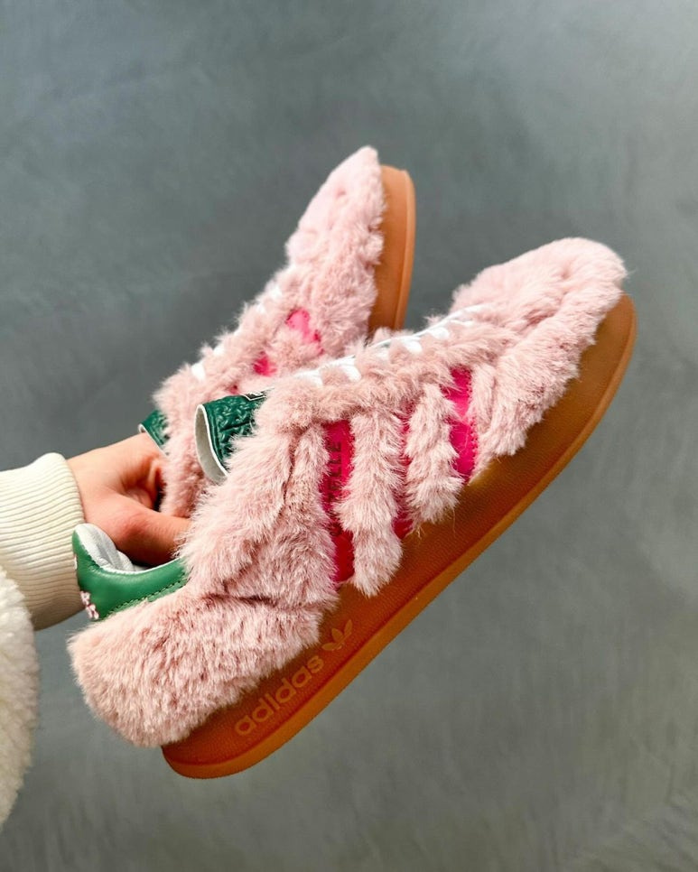 분홍색 인조 털로 가득 메운 아디다스 가젤과 핫핑크 컬러의 삼선 가젤, 그리고 초록색 뒷축과 텅