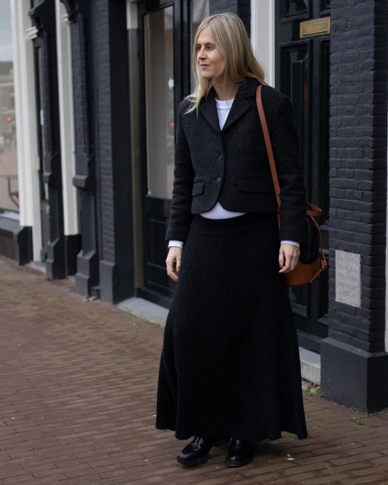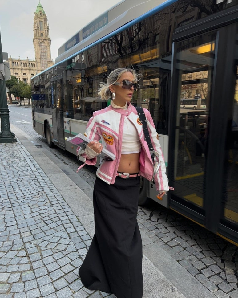 크롭한 기장의 재킷과 함께하는 롱스커트