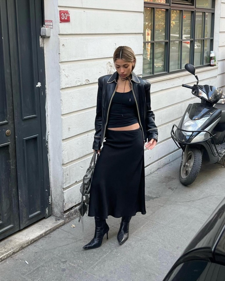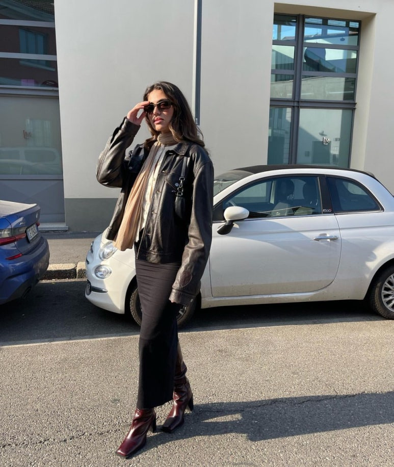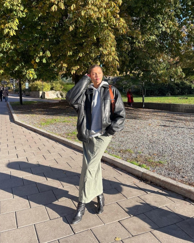 짧은 바머 스타일 가죽자켓에 코디한 롱스커트
