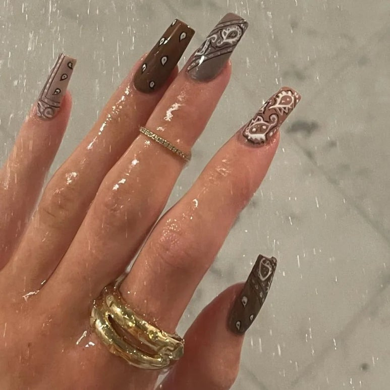 누트럴 컬러의 페이즐리 무늬를 그려 넣은 네일아트