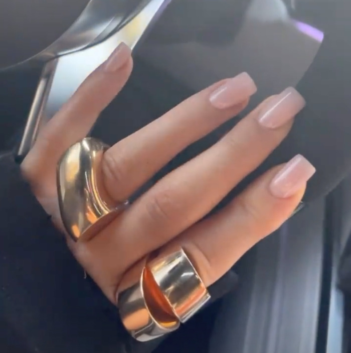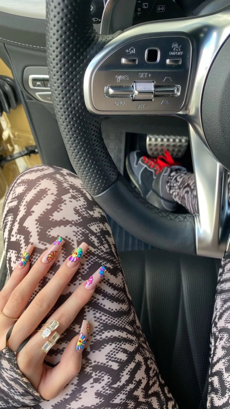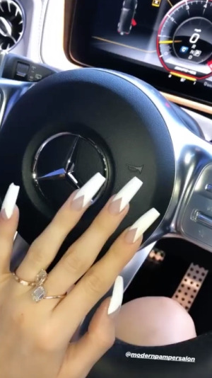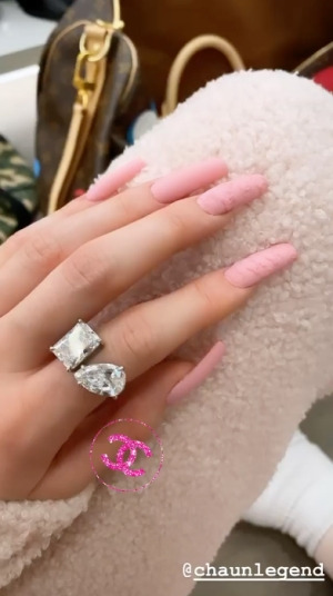 트래비스가 카일리와 스토미에게 선물한 기울어진 타원 모양 다이아몬드와 큼직한 에메랄드 컷 다이아 반지를 자랑하는 네일아트
