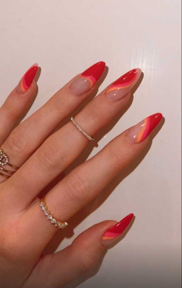 주황색과 초록색 프렌치 디자인의 짧은 바디의 네일아트
