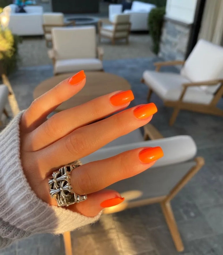 크롬하츠 반지와 함께한 풀콧 스퀘어 바디 주황색 매니큐어