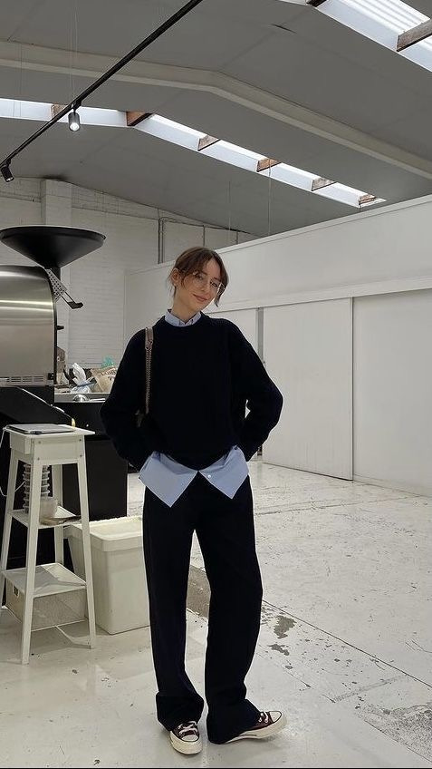 파란색 셔츠를 겹쳐입은 컨버스 코디