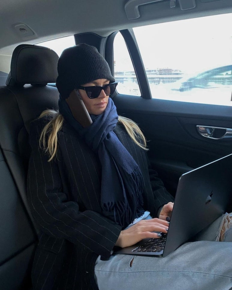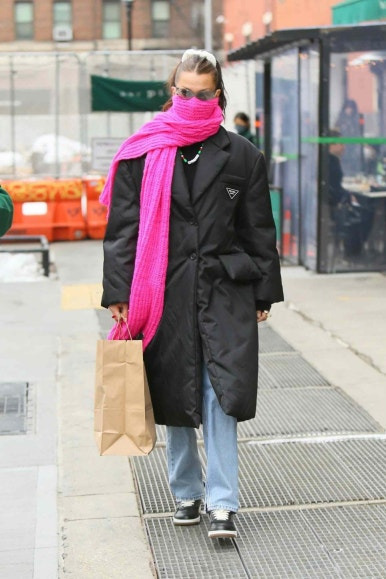 핫핑크 목도리로 얼굴을 가린 벨라 하디드