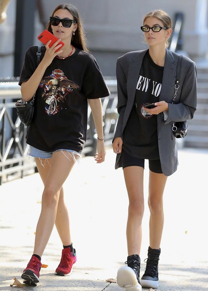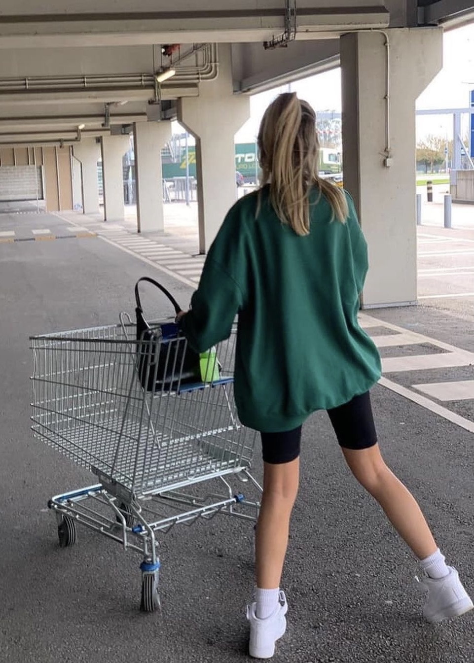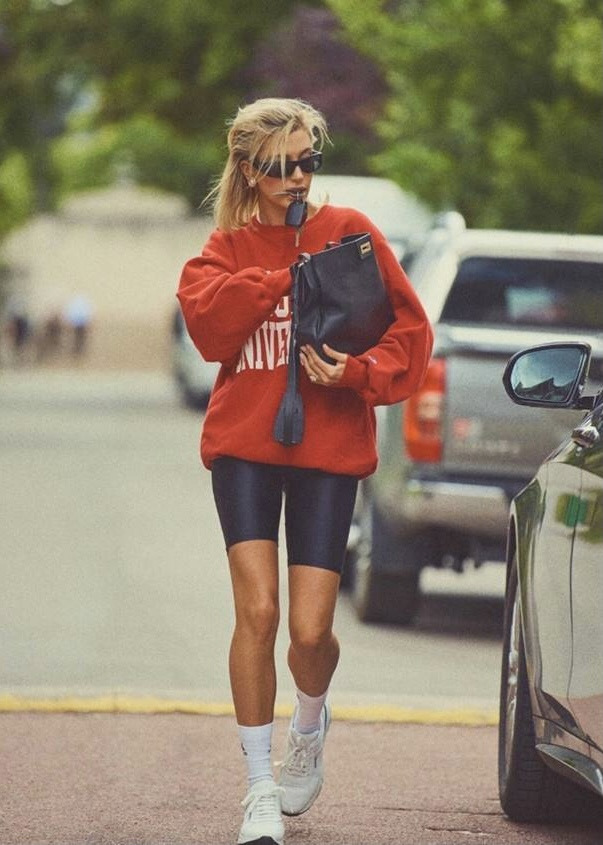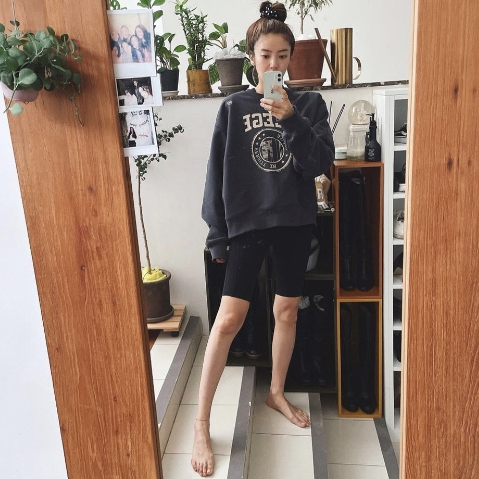 편하면서도 힙한 스트릿 룩을 보여줄 수 있는 스웻셔츠나 후디에 바이커 쇼츠 조합 코디